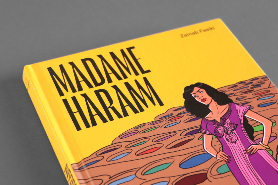 Le choix d’une typographie de titrage au caractère bien trempé entre en résonance avec l’engagement de sa bande dessinée, Madame Haram.